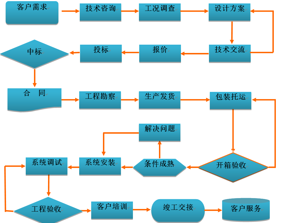 我公司經(jīng)過多年的經(jīng)驗總結,形成了一套完整合理的客戶服務流程體系,服務流程包括銷售服務、系統(tǒng)設計、采購、生產(chǎn)、檢驗、工程實施、投運、維護等各個環(huán)節(jié)。公司對相關的服務流程持續(xù)的完善和優(yōu)化,使系統(tǒng)服務的質量管理更加標準化、程序化、規(guī)范化,為系統(tǒng)服務工作奠定了扎實的基礎。